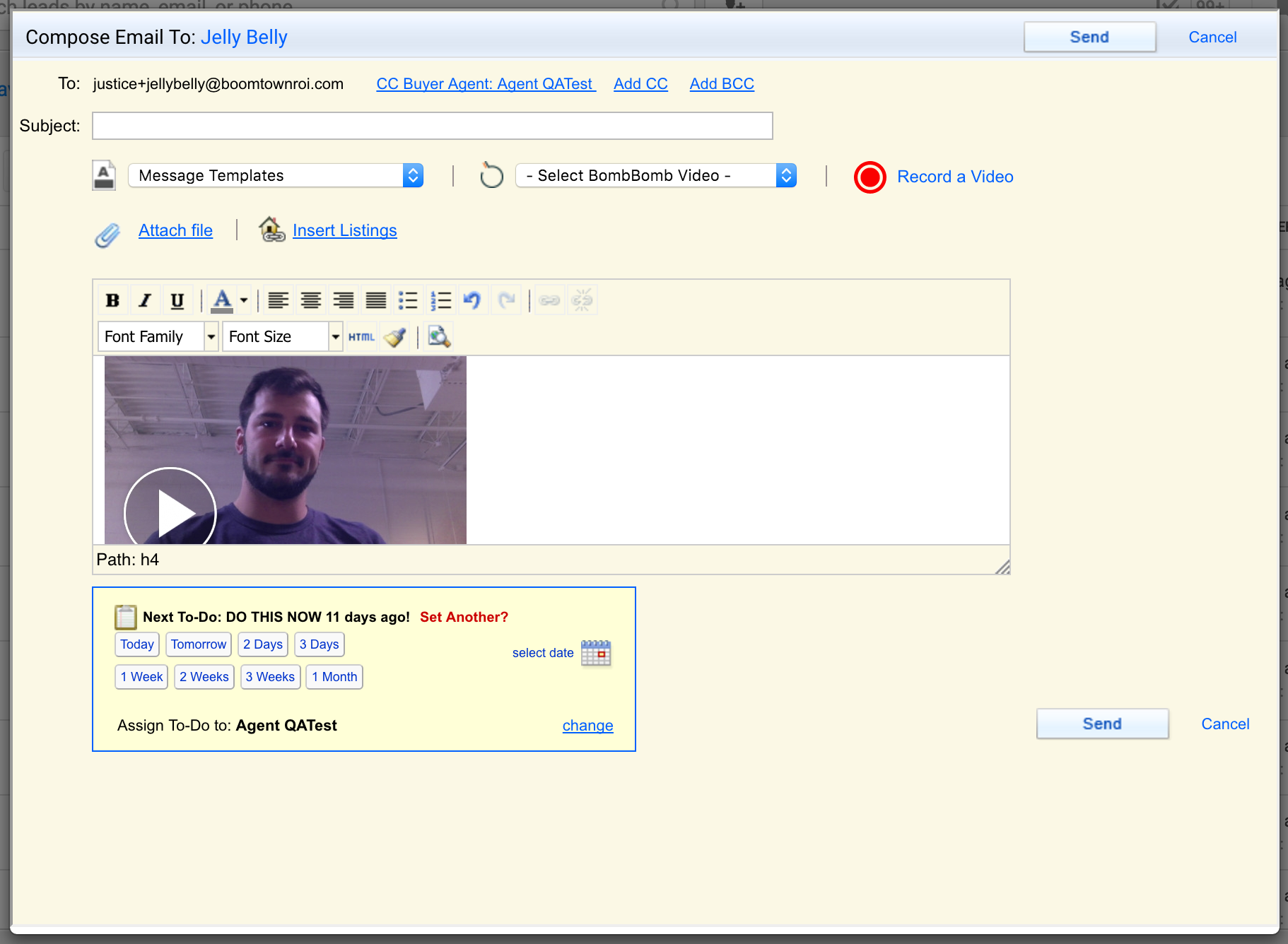 - Have BombBomb? Record a video, and start sending them for new lead intros! Don’t have BombBomb? Learn more about their product at BombBomb.com and if you’re ready for a free trial with custom conversion content and scripts use this link for BoomTown users